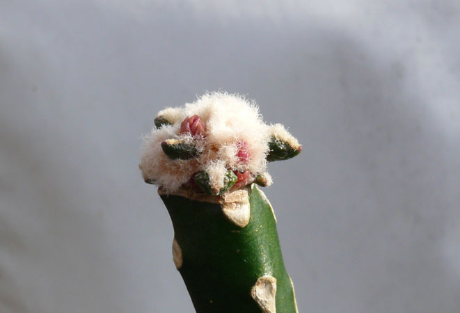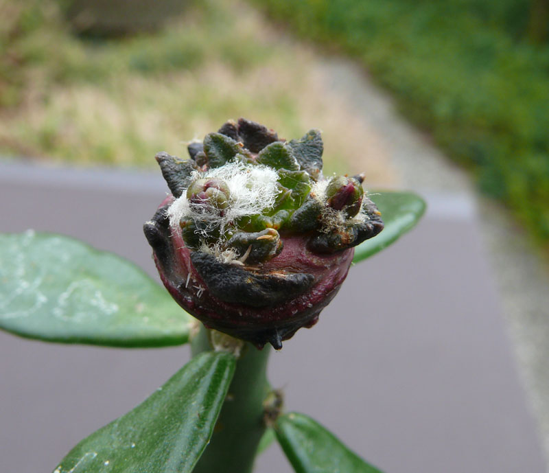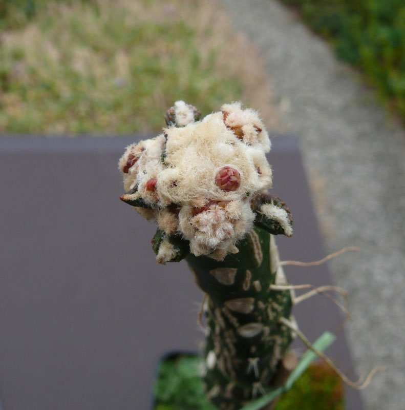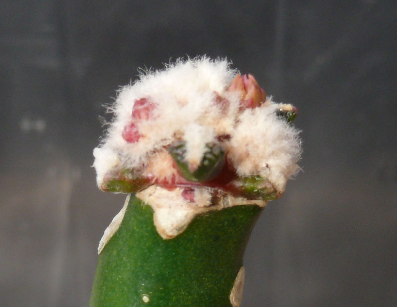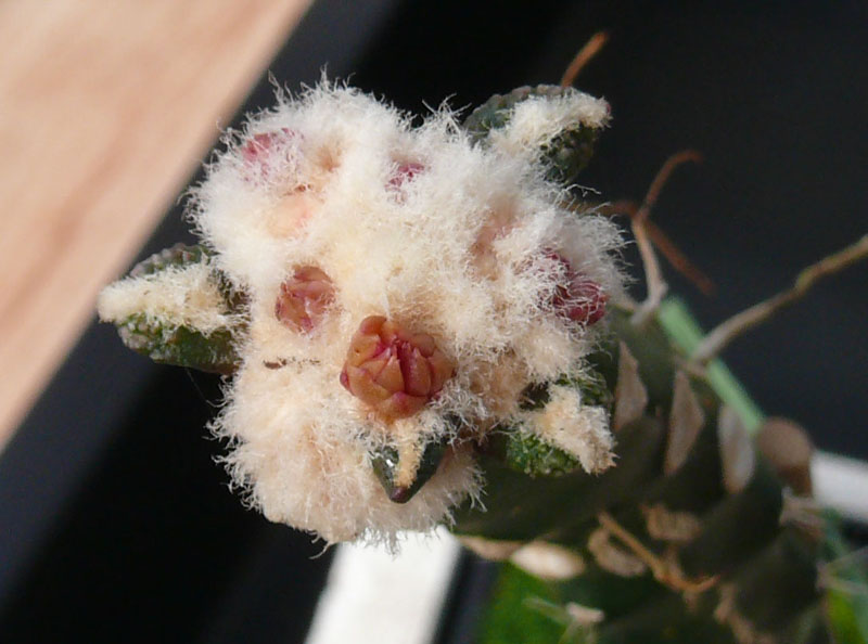 Bei einer weiteren Pfropfung, auch aus Juli, wurde ein kleiner Sproß eines gepfropften Ariocarpus bravoanus geschnitten und auf Selenicereus gepfropft. Der Sproß ist gut angewachsen und treibt sehr viel Wolle. In dieser Wolle sind schon deutlich sichtbar mehrere Blütenknospen, besonders eine ist schon sehr gut zu sehen. Der Pfröpfling hat heute eine Größe von 15 mm, über die Warzen gemessen etwas mehr. Wer kann ähnliches berichten?