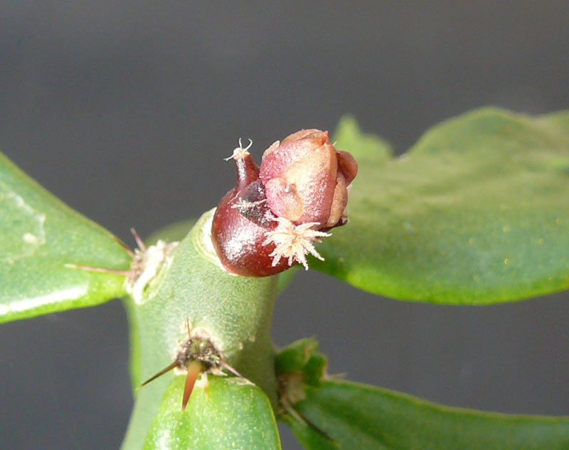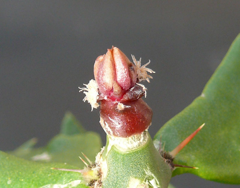 im Juli pfropfte ich diverse Ariocarpus-Sämlinge auf Pereskiopsis und Selenicereus. Seit einigen Wochen beobachte ich einen Sämling, auf Pereskiopsis gepfropft. Der kleine Sämling sieht aus, als ob er eine Blütenknospe treibt. Es ist schon recht interessant, diesen Vorgang weiter zu beobachten. Hat jemand ähnliches schon beobachtet? Die Pflanze ist/wird ein Ariocarpus retusus ssp. scapharostroides aus der Nähe von Palomas an der Las-Tablas-Straße im Staat San Luis Potosi in Mexico. Die Größe beträgt etwa 5 mm.