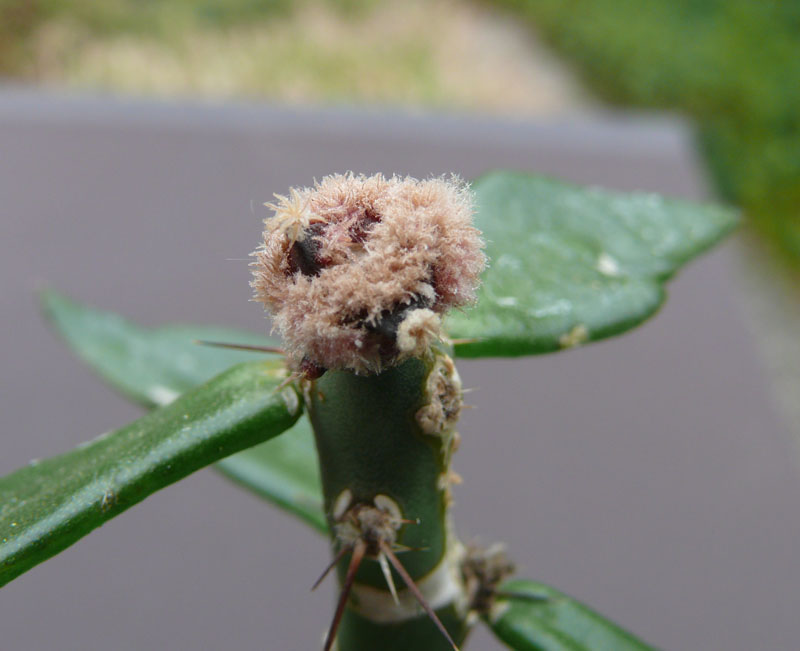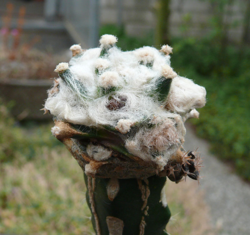 heute noch mal ein kurzer Bericht: also die vertrocknete Knospe des A. scapharostroides auf der Peresk. ist, wie schon beschrieben, vertrocknet. Sie ließ sich später leicht entfernen und hinterließ im Sämling ein Loch, dieser war praktisch ohne Scheitel. Inzwischen hat sich aber ein Kranz von Wolle um das Loch gebildet, sodaß ich annehme, daß mehrere Sprosse wachsen werden. An der zweiten Pflanze, A. bravoanus, ist auch keine der vielen Knospen durch gekommen. Sie sind alle braun geworden und vertrocknet. Statt dessen bildete sich viel Wolle in den Achseln und es sieht auch hier so aus, als würden einige Sprosse wachsen. Es war also nichts mit dem frühen Blühen.