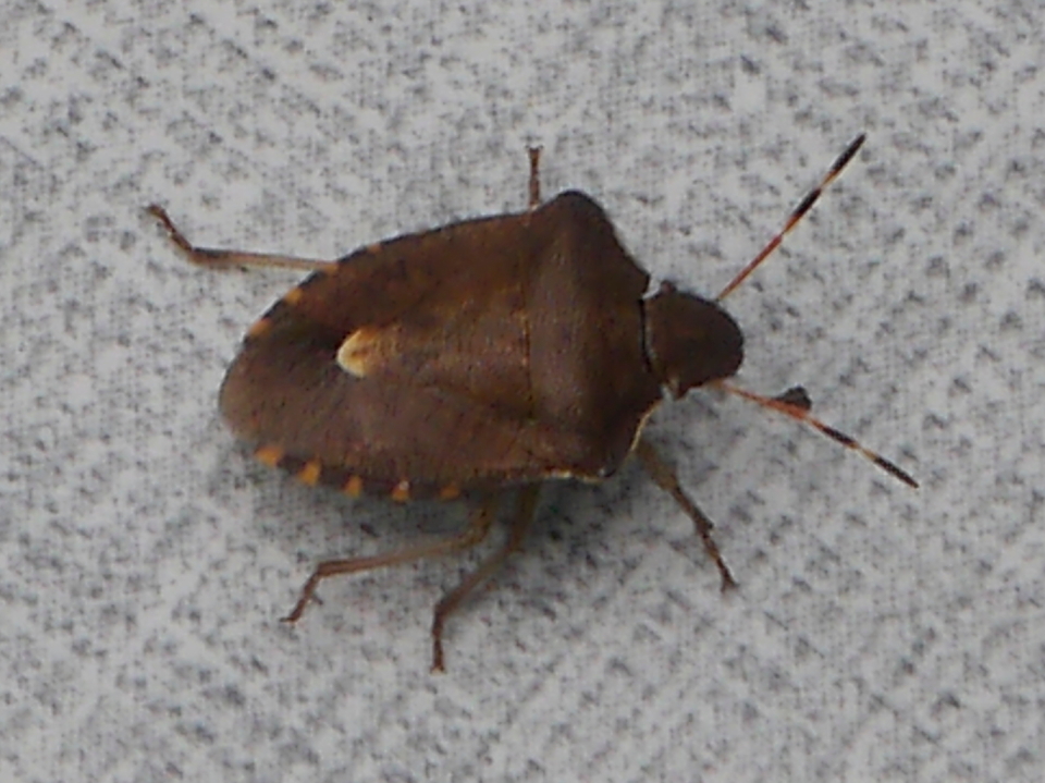 Interessante Schadbilder! Die Wanze dürfte Palomena prasina sein, die Grüne Stinkwanze - deren Winterkleid ist braun und die sonstigen Merkmale passen gut.