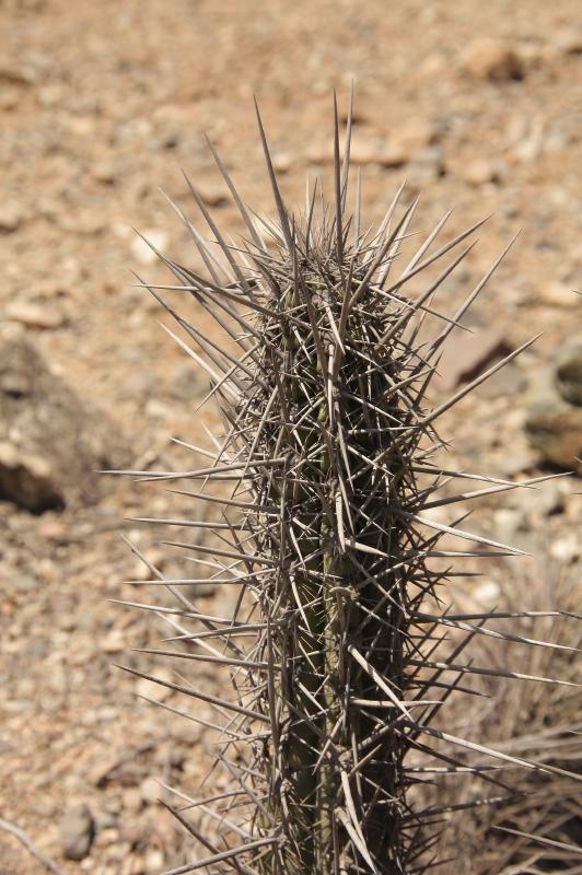 Der Kaktus ist derzeit etwa 60 cm hoch, Durchmesser ca 4,5 cm in der breitesten Zone. Die Mitteldornen sind bis zu 7 cm lang.