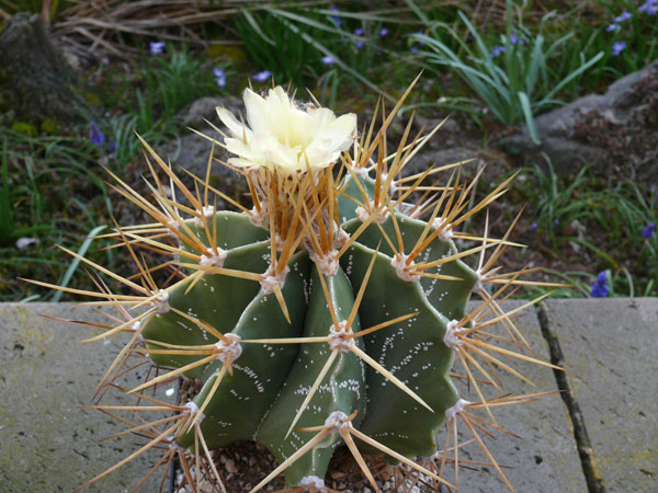 Die Pflanze steht hoch unter Glas auf der Hänge im vollen Sonnenlicht, dementsprechend ist auch die Bedornung und deswegen können sich auch die Blüten nicht vollständig öffnen. Schön an dieser Pflanze ist die honiggelbe Bedornung, ich habe auch noch andere Pflanzen mit brauner und noch stärkerer Bedornung, aber bisher ohne Blüten. Astrophytum ornatum wächst gut in rein mineralischem Substrat mit Lehmzusatz, aber recht langsam.