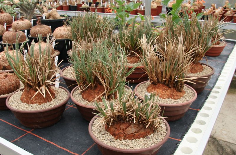 Jetzt stehen sie gerade frostfrei im Gewächshaus unter den Tischen. Seit Ende September / Anfang Oktober gibt es kein Wasser, denn die recht großen Töpfe trocknen ja nur langsam ab. Bis in den März stehen sie dort, danach geht es raus - sobald das Wetter es zulässt. Leichter Frost wird ertragen.