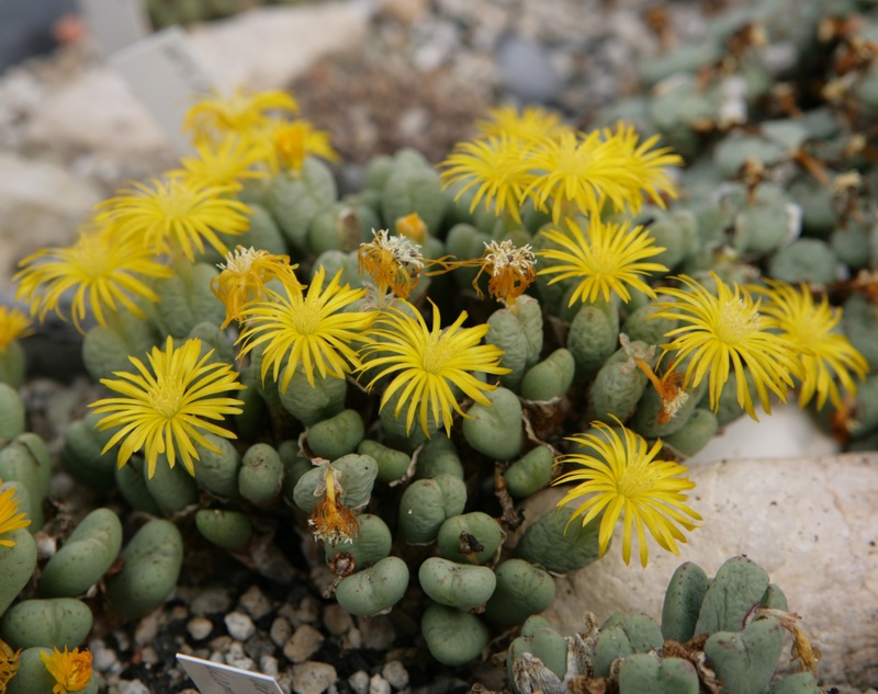einen hab ich auch noch blühend gefunden. Auf dem Schild steht: Conophytum minutum subsp. pearsonii 'glabrum' Bitterfontein.