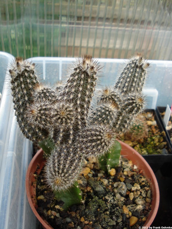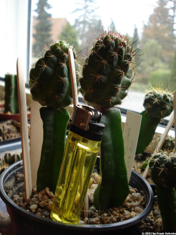 gut gebrüllt, Löwe! Es sind meine ersten Probepfropfungen um zu sehen wie es klappt. Der von dem ich sie bekam zeigte mir Bilder von beispielsweise Setiechinopsis miserabilis, die vom Januarsämling bis zur großen Blühpflanze mit vielen Blüten nur wenige Monate brauchte. Das wollte ich selbst ausprobieren. Selbstverständlich ist mir klar, daß diese Unterlage nie als Dauerunterlage herhält, aber um kleine Sämlinge von langsam wachsenden Arten etwas schneller groß zu kriegen brauchbar erscheint. Schaun mer mal weiter....