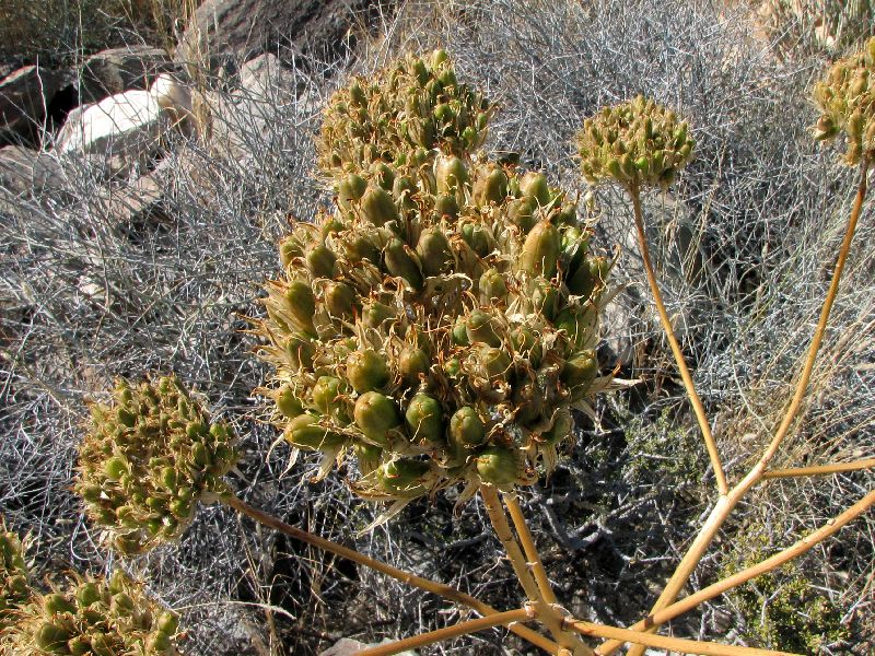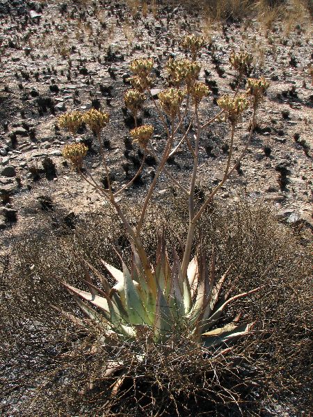 004 Aloe hereroensis var. lutea (Aloaceae) Zum Glück brennt das umliegende Gras nicht allzu lange und bei näherer Inspektion konnten wir feststellen, dass die Blütenstände/Samenkapseln noch intakt waren.