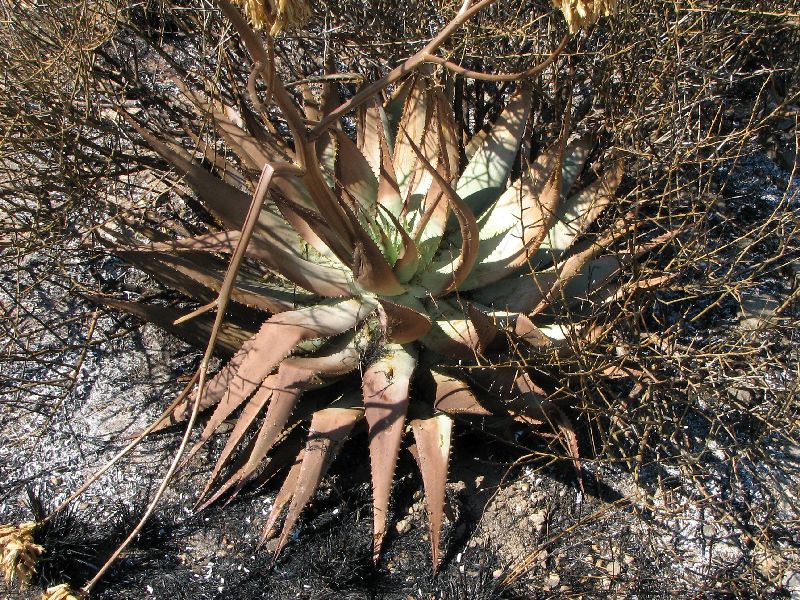 006 Aloe hereroensis var. lutea (Aloaceae) Begleitpflanzen, die ebenfalls das Feuer überstanden hatten, waren u.a. einige Commiphoren.