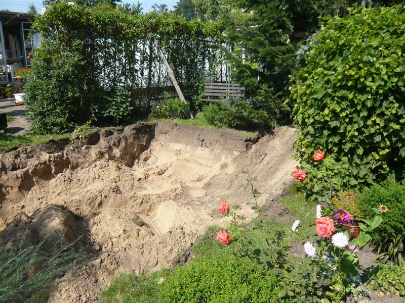 Im Frühjahr sind wir zu viert nach Thüringen gefahren und haben ein gebrauchtes Pricess Gewächshaus abgebaut und in einer Garage derweil eingelagert. Der Baubeginn war durch die Gartenübernahme festgelegt. Ich durfte Ende August mit den notwendigen Arbeiten beginnen. Das beste Plätzchen war schnell gefunden. Es sind nur 40cm Mutterboden, dann kommt herrlicher Sand. Das Haus ist 12m², groß der Boden sollte tiefer liegen, so das die ersten Pflanzen kurz über dem Fundament stehen würden. Für diese Arbeit sollte Technik her. Die Ankunft des Baggers wurde sehnlichst erwartet.