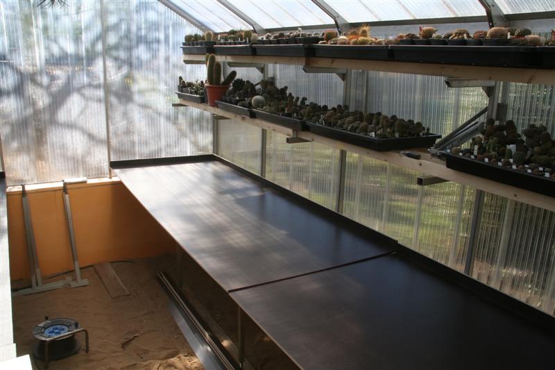 Die ersten Pflanzen sind eingezogen und belegen die zwei oberen Stellagen. Die zwei Tische für unten 1m tief sind in arbeit und bieten den restlichen Pflanzen Platz. Um die Stellagen und zwei Tische ist Platz zur Verglasung. Ich hoffe die Zirkulation der Elektrotherm 5-Kanal- Umluftheizung mit 2KW wird reichen das Haus frostfrei zu halten. Noppenfolie an der Giebelseite und Längsseite der Schiebetüren wäre noch eine Möglichkeit.