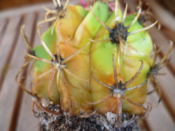 Zu meinem Entsetzen habe ich heute Vormittag bemerkt, dass sich die Haut meines Ferocactus latispinus gelb-rötlich verfärbt hatte. Bei näherem Hinschauen habe ich zusätzlich noch weiße Flecken bemerkt die sich in Bodennähe befinden. Als ich versuchte diese vorsichtig zu entfernen sah ich daß der Ferocactus innen schon etwas verfault war. Leider konnte ich nicht erkennen um was es sich hierbei handelt.