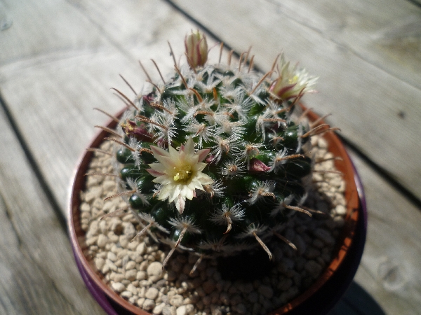 Heute haben sich die Blüten meiner M. duwei (wird auch zu M. crinita gestellt) geöffnet. Wie ich finde ist dies eine der schönsten Mammillarien überhaupt, da die weißlichen Blüten optisch gut zu den Dornen und dem grünen Körper passen.Wenn das Wetter in den nächsten Tagen auch so schön bleibt werden sich die restlichen Blüten bestimmt auch noch öffnen
