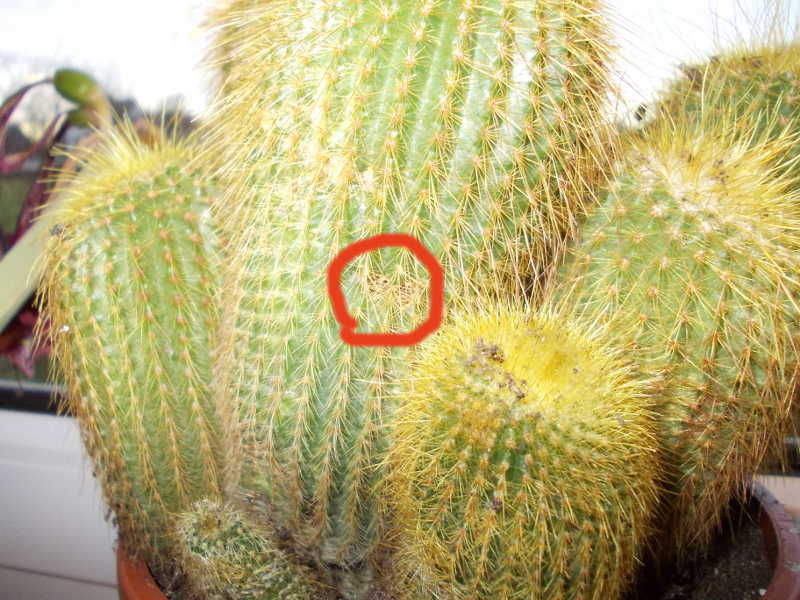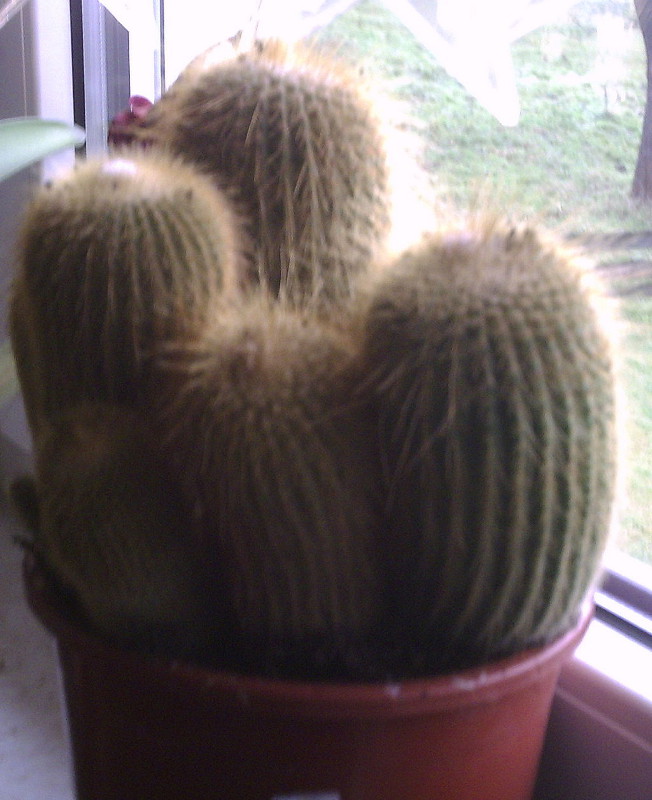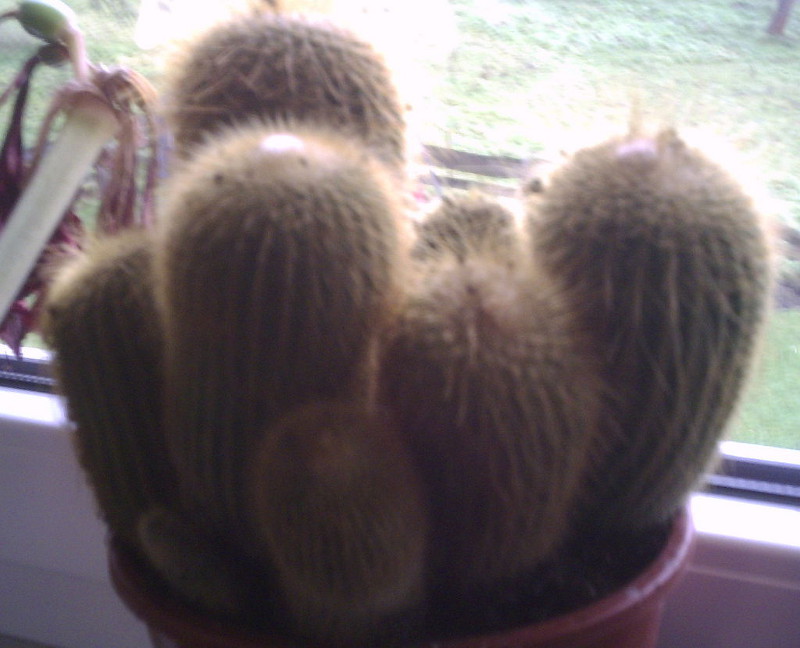 ich habe wieder einen neuen Kaktus, weiß auch nicht genau, wie er heißt, ich vermute aber in Richtung Haageocereus. Er ist ganz unten unter der Erde verzweigt, und hat ganz oben auf den Spitzen Cephalium. Ich habe ihn aus Mitleid gekauft, da er in einen Topf mit 10 cm Durchmesser getopft war, ich habe ihn in einen Topf mit doppeltem Durchmesser umgetopft. Er ist an einigen Stellen allerdings etwas weich, was mich wundert. Er hat auch einige Verkorkungen, und unten ist er ganz grau, was aber ganz hart ist. Die weichen Stellen sind ungefähr 5 cm über der Erde, und sie haben ungefähr 2-3 cm Durchmesser. Bei einigen sind in der Mitte dunkelbraune, katzenaugenförmige Stellen, das Braune ist in einer Art Kerbe drin und bedeckt deren Innenseite. Das Braune ist nur 1mm dick, darunter ist grün. Die weichen Stellen sind normalfarben. Einige Stellen auf dem Kaktus sind auch eingedellt.