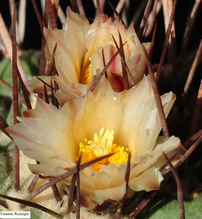 Die Blüten gehören einen alten,lang bedornten Thelocactus hexaedrophorus.