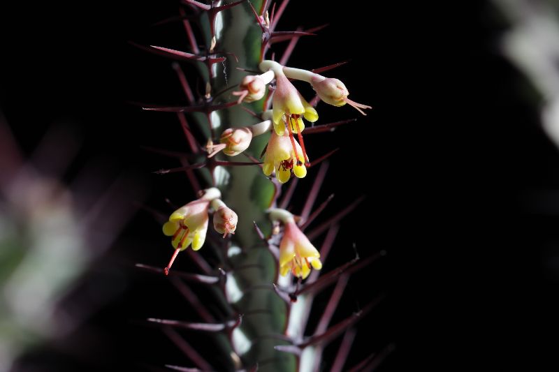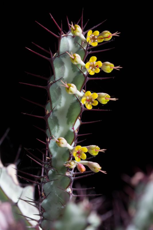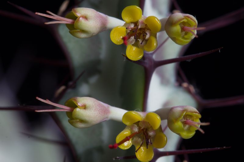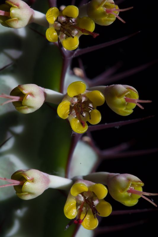 Der Grund, warum ich diese Art so mag: Sie ist schon ohne Blüten sehr dekorativ mit ihren blaugrün gemuszterten und rotbraun bedornten Trieben, und die zahlreichen, leuchtend gelben Blüten (ich weiß: Blütenstände / Cyathien) mit roten Staubfäden sind wirklich eine besondere Zierde. Auch wenn sie gattungstypisch nur etwa 3-4 mm Durchmesser haben ...