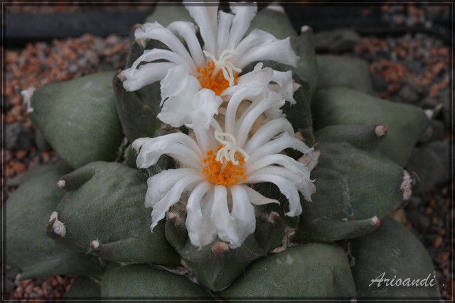 Heute hat mich ein Ariocarpus furfuraceus cv. Mituibo (Three Finger) mit zwei Blüten erfreut. Der frühe Blühtermin liegt wohl daran, dass die Pflanze erst vor einigen Wochen den Weg von Thailand in mein Gewächshaus gefunden hat.