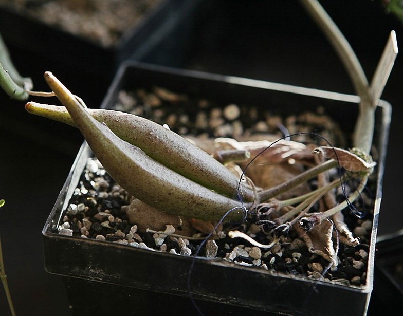Nach der Handbestäubung Anfang Juni haben sich die Früchte langsam, aber konstant entwickelt. Typisch für einige Brachystelmen ist es offensichtlich, die Früchte sehr lange in einem "grünen" Zustand zu erhalten, obwohl die Samen im Inneren bereits reif sind. Nur, ansehen kann man es ihnen nicht. Wir haben die Frucht jetzt abgeschnitten, da die Knolle sehr stark beansprucht wurde und trotz giessen (was einem im Winter jedesmal die Schweißperlen auf die Stirn treibt) keine Anstalten gemacht hat, Wasser aufzunehmen.