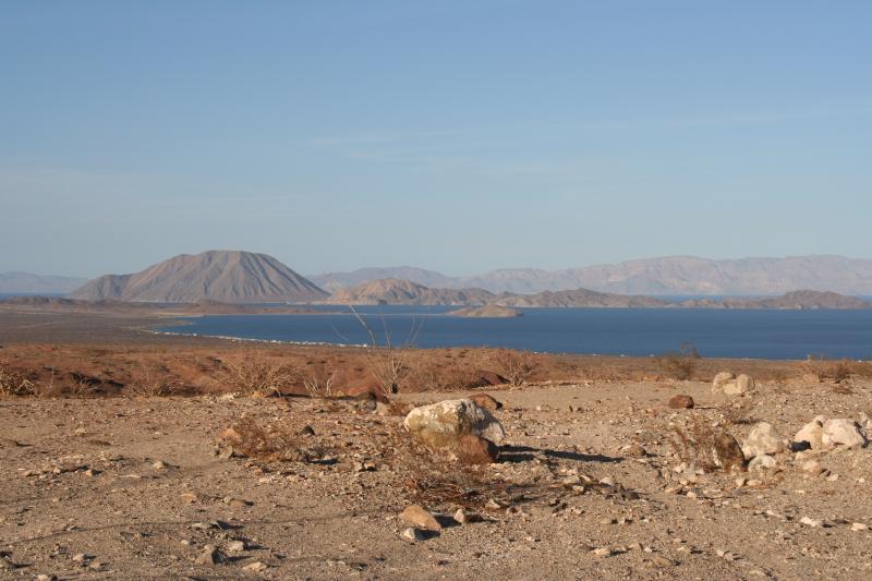 Die Insel mit dem Vulkankegel im Mittelgrund (Isla Coronado / "Bahia de los Angeles") ist u. a. ein Fundort von Mammill. insularis.