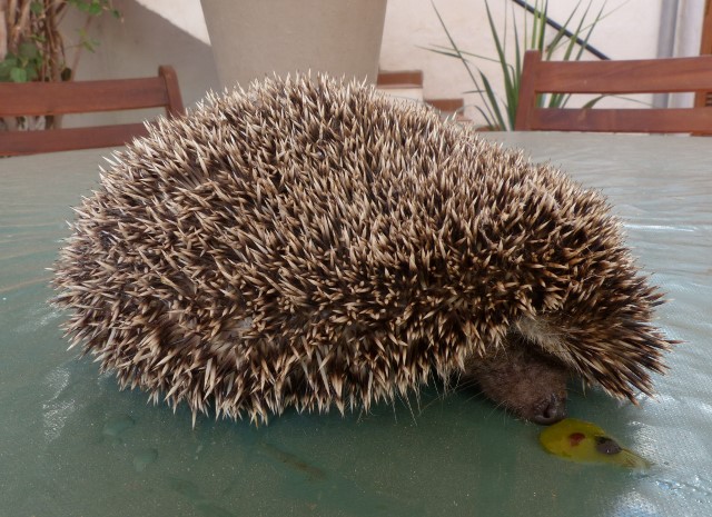 hochgenommen, und das Stachelkleid von den meisten Stacheln mit einer Pinzette befreit. Den Igel setzte ich in eine Wasserschale, der