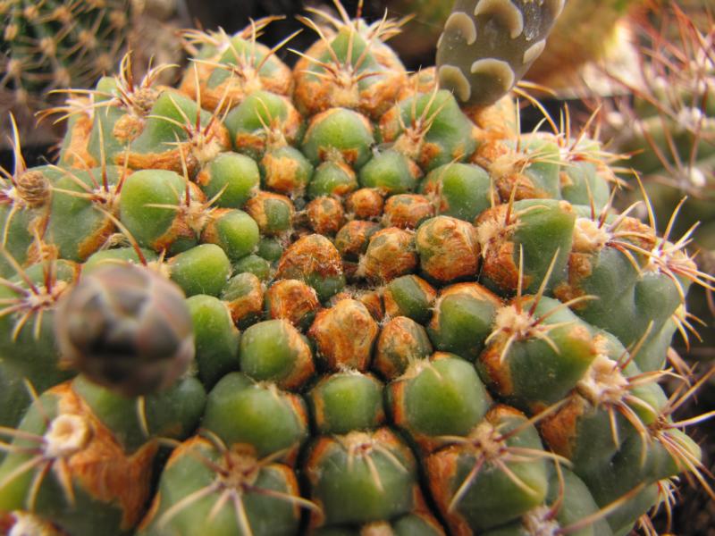 Auch ich kenne derartige braune Flecken, ebenfalls vor allem bei Gymnos, aber auch anderen Gattungen, z.B. Rebutien (vielleicht fällt's bei dichter bedornten Arten nur nicht so auf ...). Da es eigentlich immer nur bei Pflanzen auftritt, die nicht "richtig" wachsen - z.B. wenn das Umtopfen mal wieder weit überfällig war -, halte ich es für eine Wachstumsstörung, eventuell Nährstoffmangel.