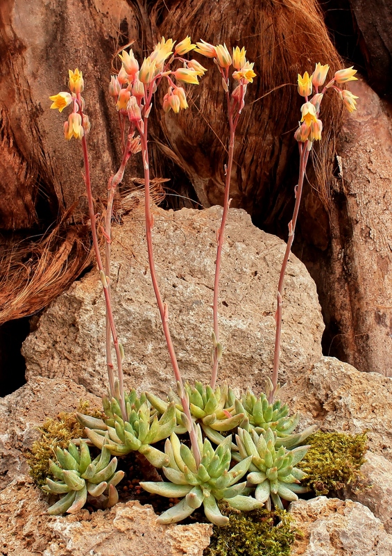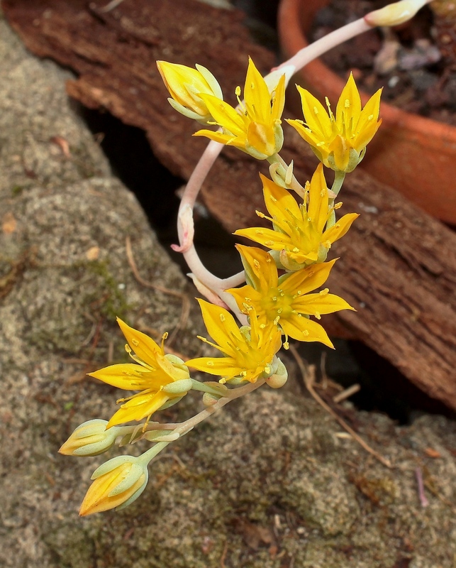 Genug der Taxonomie. Viele Hybriden sind interessante und blühfreudige Pflanzen. Der einzige Wermutstropfen ist, wie bei fast allen Crassulaceae, daß sie Schmier- und Wollläusen besonders gut schmecken und die letzten Jahre auch Thripse gefallen an ihnen gefunden haben. Entweder man giftet, arbeitet mit Nützlingen (Australischer Marienkäfer, Raubmilben) oder stellt die Pflanzen über den Sommer raus. Beide Schädlinge mögen nämlich keinen Regen von oben, die genannten Crassulaceae dagegen kommen mit unseren sommerlichen Regenfällen, bei gut durchlässigem Substrat, sehr gut zurecht. Die oft empfohlenen Mischungen mit Sand und Torf und ähnlichem halte ich für nicht ideal. Von Natur aus sind die Eltern Felsspaltenbewohner. Da stopft auch niemand Sand oder Torf rein. Wie Kakteen kommen sie bei mir in eine gröbere mineralische Mischung mit ca. 1/4 humosen Bestandteilen. Diese aber aus torffreier Blumenerde auf Holzbasis. Dabei entwickelt sich das feine Wurzelwerk zu einem wunderbarem dichten Filz.
