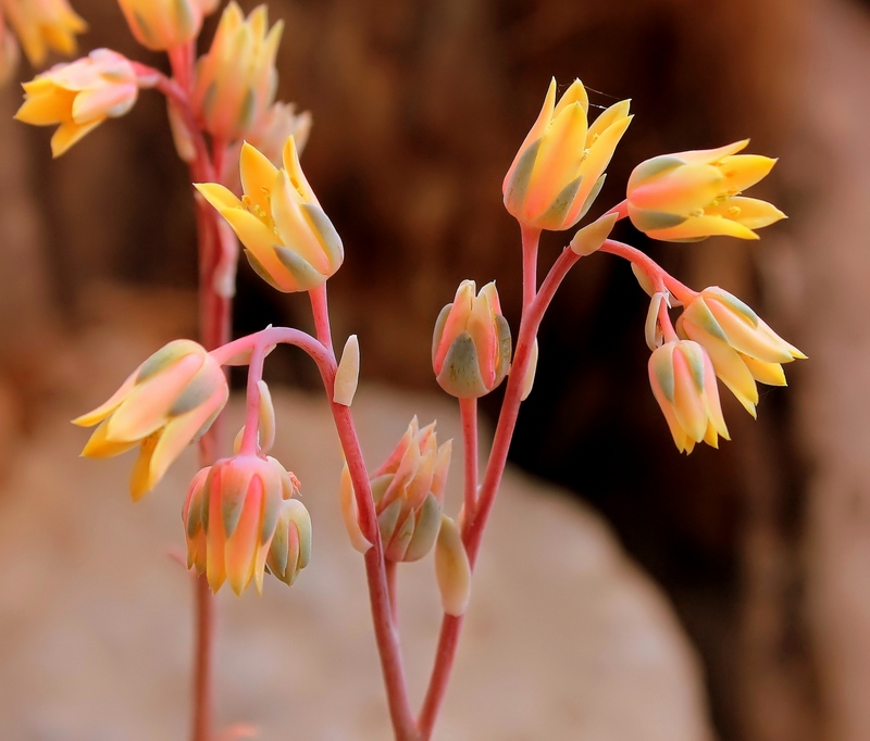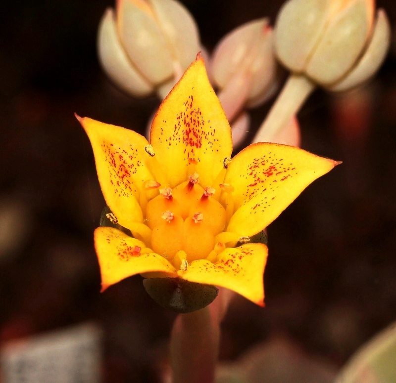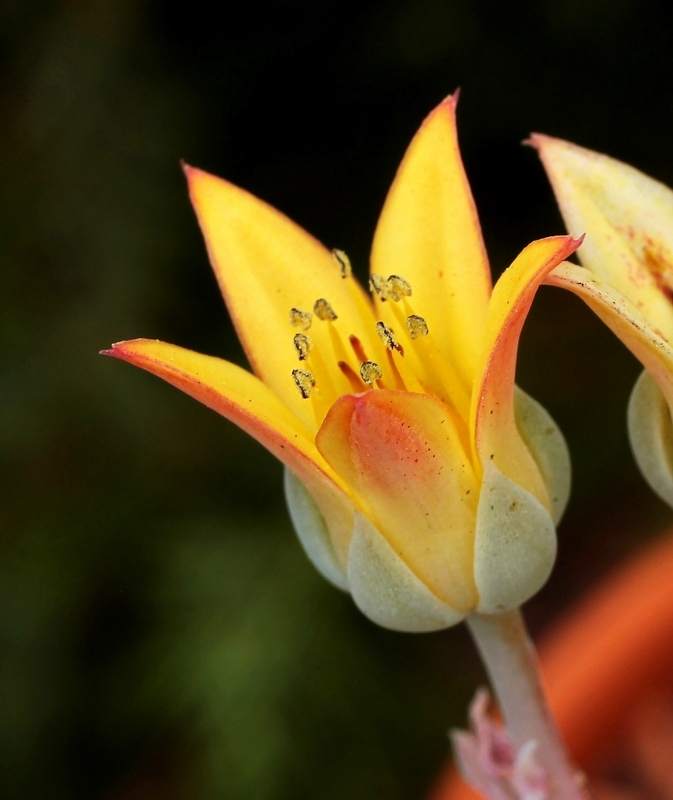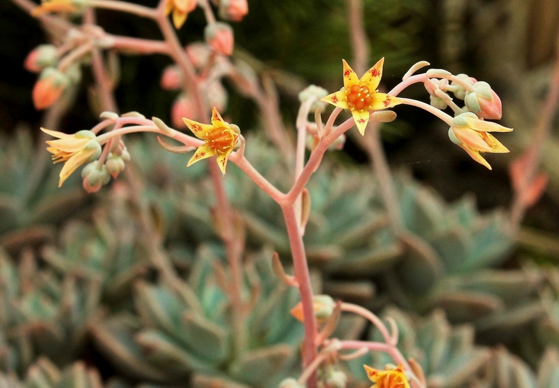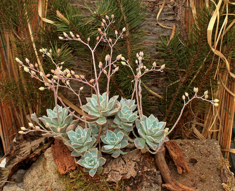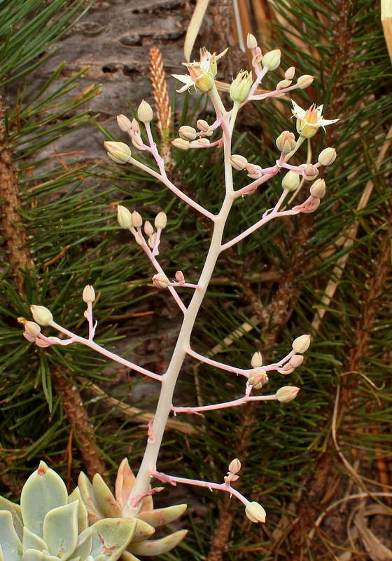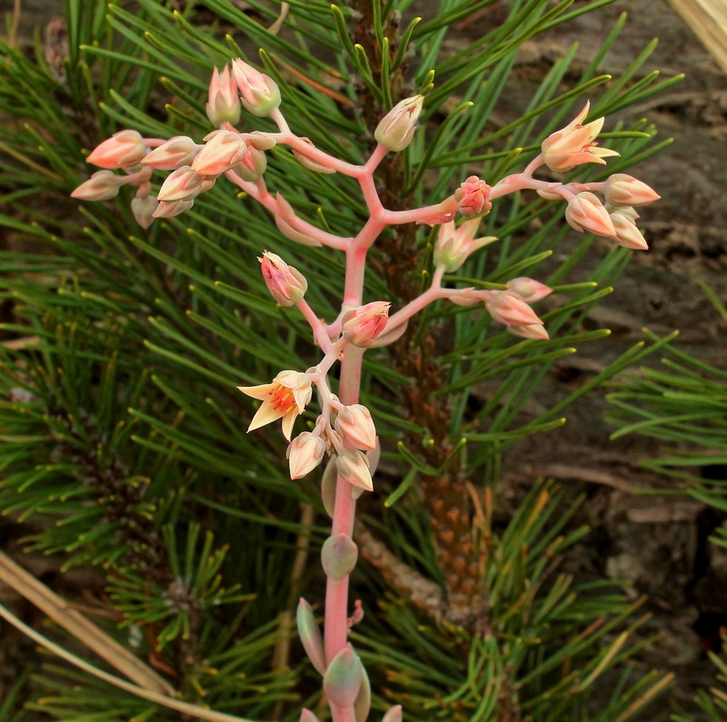 X Sedeveria ´Merlin´ ist eine interessante Hybride. Elternteile sind Sedum allantoides agg. (S. alexanderi, S. allantoides, S. all. ´Goldii) x Graptopetalum paraguayense. Besonders die Morphologie des Blütenstandes und die Öffnung der Blüten sind bemerkenswert. Wie bei dem genannten Sedum ist der Blütenstand nämlich eine pyramidale Rispe und die Blüten öffnen sich von oben nach unten! Graptopetalum paraguayense ist zwar sonst recht dominant, aber hier hat sich das Sedum durchgesetzt. Übrigens ist das auch ein Argument, weshalb die Abtrennung dieses Sedum von der Gattung diskutiert wird.