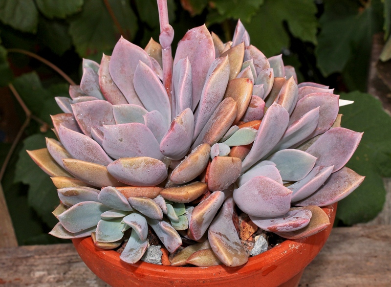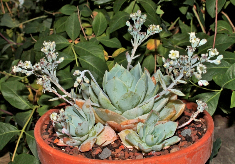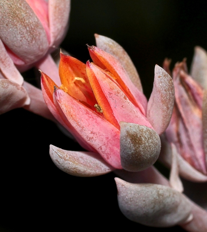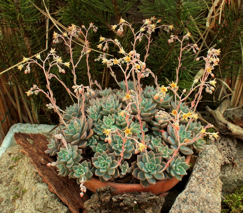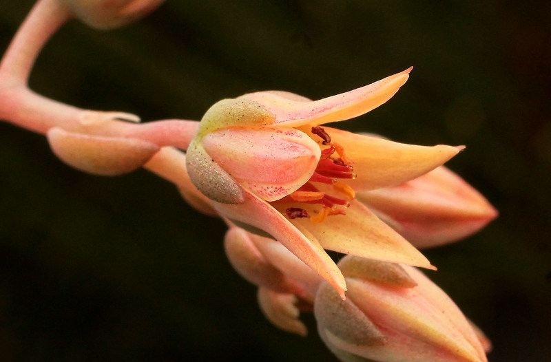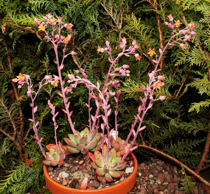 Fast alle Kreuzungen, die Echeveria amoena als Elternteil haben, sind ausserordentlich hübsch und blühfreudig. Leider haben sie aber auch die Rieselfähigkeit der Hochblätter am Blütenschaft geerbt, so daß man aufpassen muss, die Pflanze nicht plötzlich überall in den Töpfen zu haben.