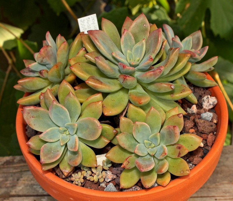 Die fotografierte große Schale musste ich vor meinem Umzug auf 3 Rosetten reduzieren und habe den Rest dem Kompost anvertraut. So was tut natürlich weh, auch bei anderen Schaupflanzen, die ich hatte. Wenn man aber nur einen VW-Lupo besitzt, muss man sehen, wie man so viele Pflanzen wie möglich auf einmal von Lüneburg nach Magdeburg bekommt. Die leichte Vermehrbarkeit dieser Pflanzen lindert den Schmerz aber ein wenig, weil man weiß, daß die Stecklinge ohne Probleme wieder anwachsen werden.