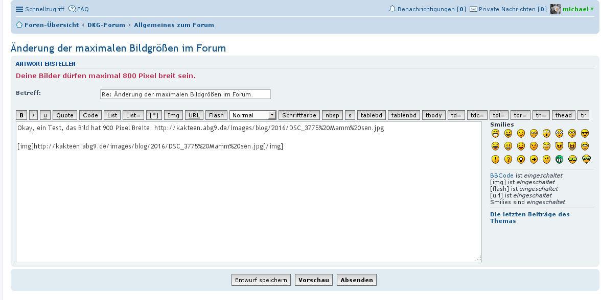ich wollte gerade ein externes Bild via [img] einbinden. Da bekomme ich immer noch die Meldung, das das Bild maximal 800 Pixel Breite haben darf!?