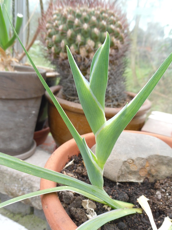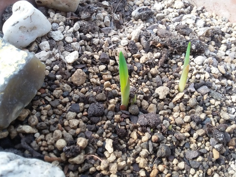 Nachdem ich jetzt drei Jahre lang immer nur ein paar Blätter im Winter hatte, habe ich die Hoffnung langsam aufgegeben, und den Topf mit den Knollen im jetzt abgelaufenen Winter im ungeheizten Gewächshaus gelassen. Und gerade als ich Anfang April dachte, jetzt stelle ich Dich mal raus, das wird wohl nichts mehr, da sehe ich, dass sie einen Blütenstand zu bilden scheint: