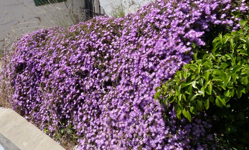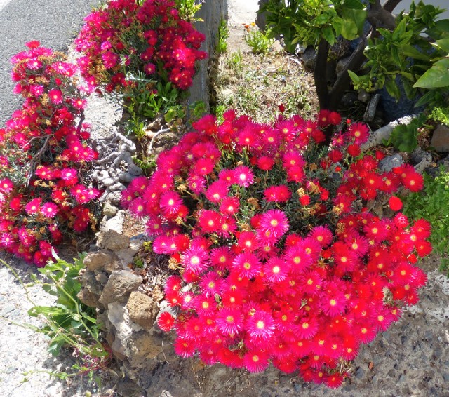An Trockenmauern wachsen diverse Lampranthus Hydriden. In milden Wintern in Deutschland sollten diesePflanzen überleben.