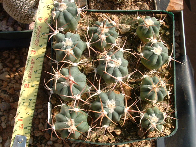 Mangels Pollen eines zweiten Ecac parryi hatte ich mal mit Pollen von Ecac horizonthalonius bestäubt. Wie für parryi typisch keimten die Samen gut. Der resultierende Hybrid war in Rippenform, Bedornung und Blütenfarbe genau in der Mitte seiner Eltern angesiedelt.