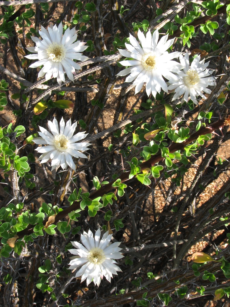 Wie jedes Jahr im September blühen meine Peniocereus diguetii wieder in den knapp 3 m hohen Fouquieria formosa als Stützpflanzen. Jede mit etwa 15 Blüten. Eigentlich sind das Nachtblüher, aber da es zur Zeit recht kühl ist, halten die Blüten bis zum Vormittag des nächsten Tages durch: