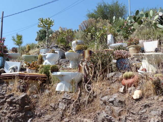 pflanzte man Blumen. An einem Hang fiel mir eine Sammlung von Toilettenschüsseln auf als Pflanzschalen für Kakteen