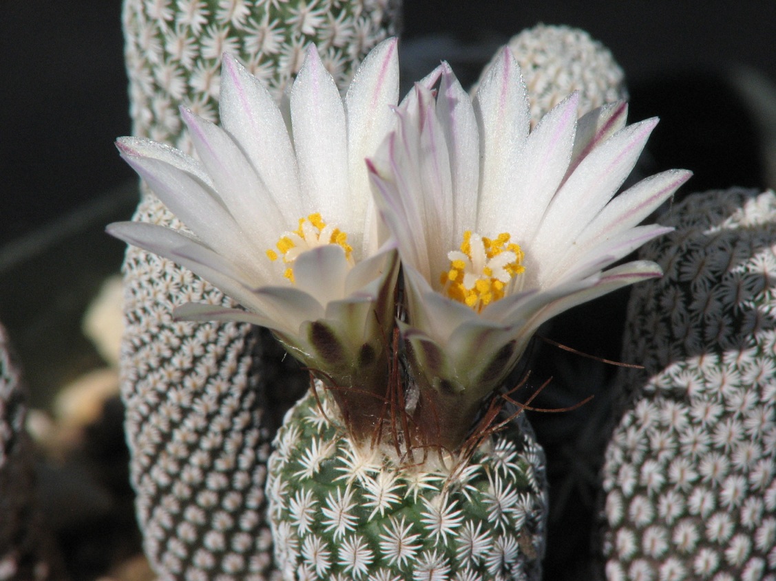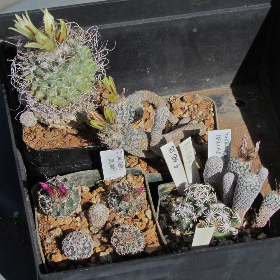 Ich hätte gesagt, der Unterschied des T. heliae zum T. krainzianus ssp. minimus besteht in Größe und Farbe der Blüte. Denn zumindest bei mir blühen beide und auch der Turbinicarpus macrochele zur selben Zeit.