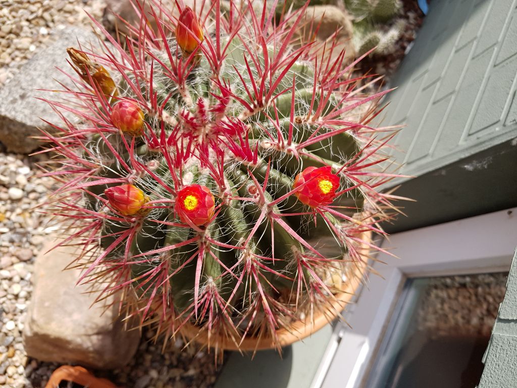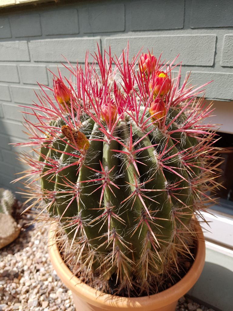 Ich habe diesen Kaktus seit ca. 20 Jahren schon in ansehnlicher Größe geschenkt bekommen. Er ist jetzt ca.30 cm hoch, sehr langsam gewachsen und blüht zum ersten Mal (s. Bild). Ich vermute es handelt sich um eine Ferocactus-Art. Weiß jemand genaueres über die Art?