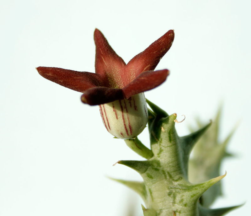 Äußere Corona becherförmig, fast immer mit Necktar gefüllt, innere Coronafortsätze nur kurz zusammenneigend-aufsteigend. Gynostegium dunkel scharz-rot.