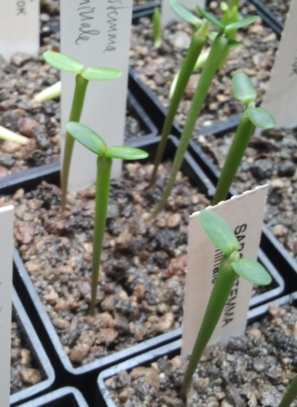 Hier ein Foto von 12 Tage alten Sämlingen der Art Sarcostemma viminale. Das Saatgut habe ich von Koehres. Die ersten Pflanzen sind nach 11 Tagen gekeimt. Das Zimmergewächshaus stand bei etwa 30 Grad unter einem großen Velux-Nordfenster.