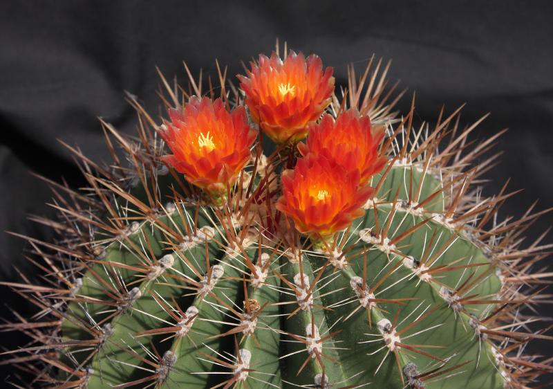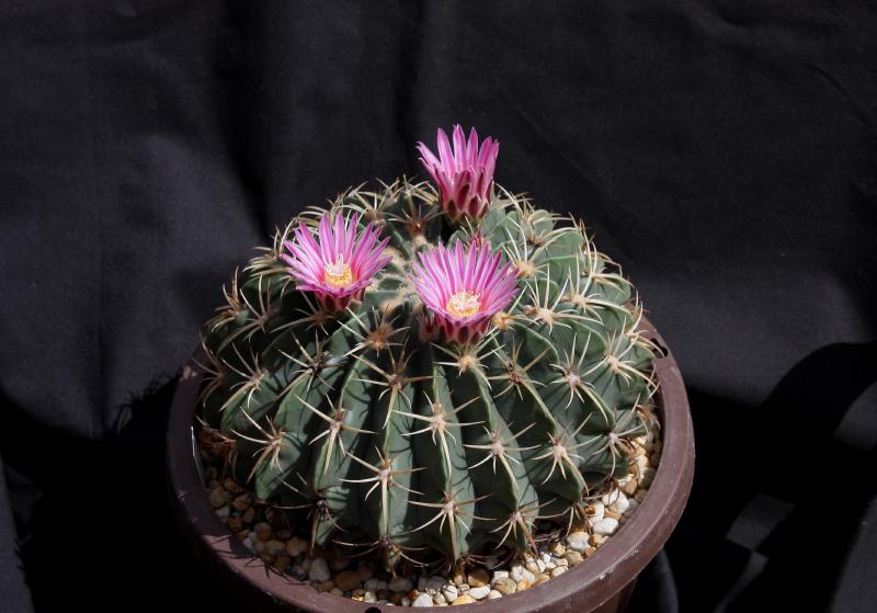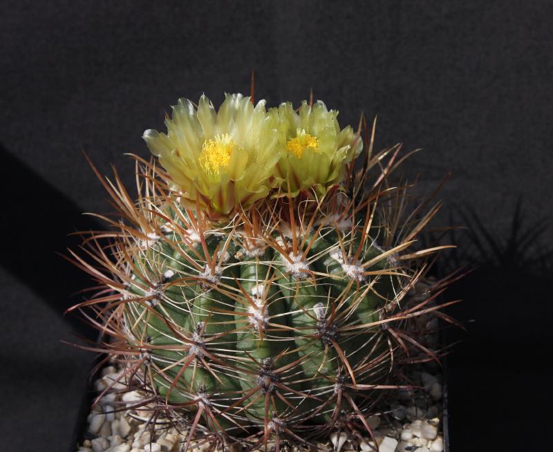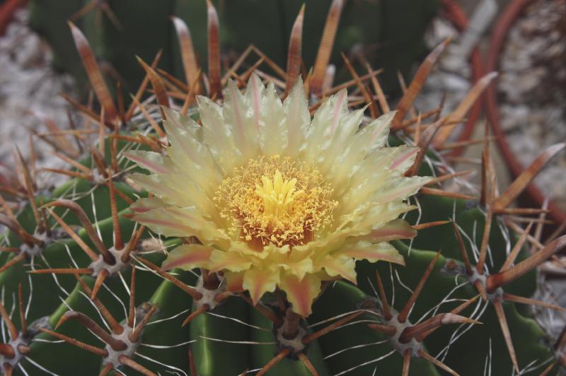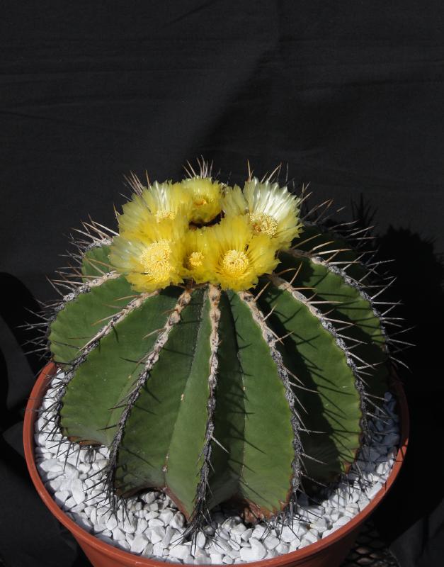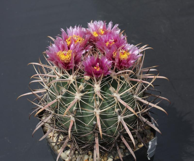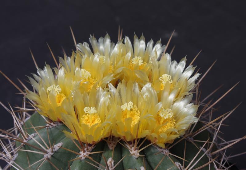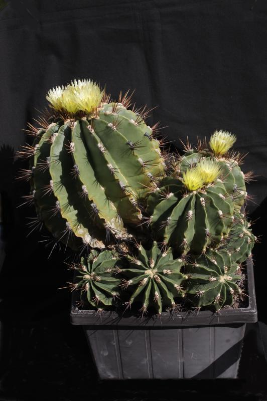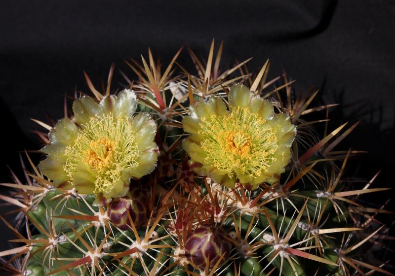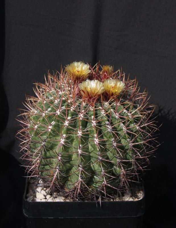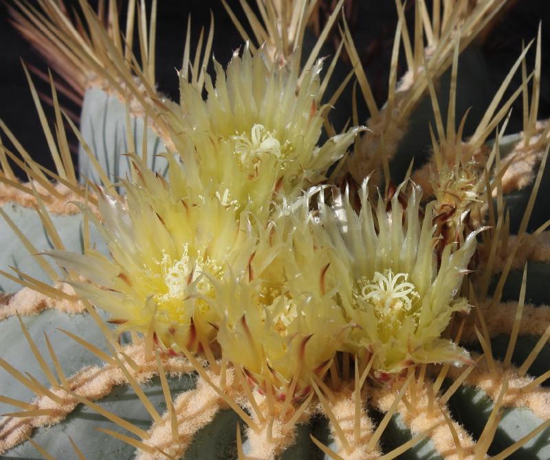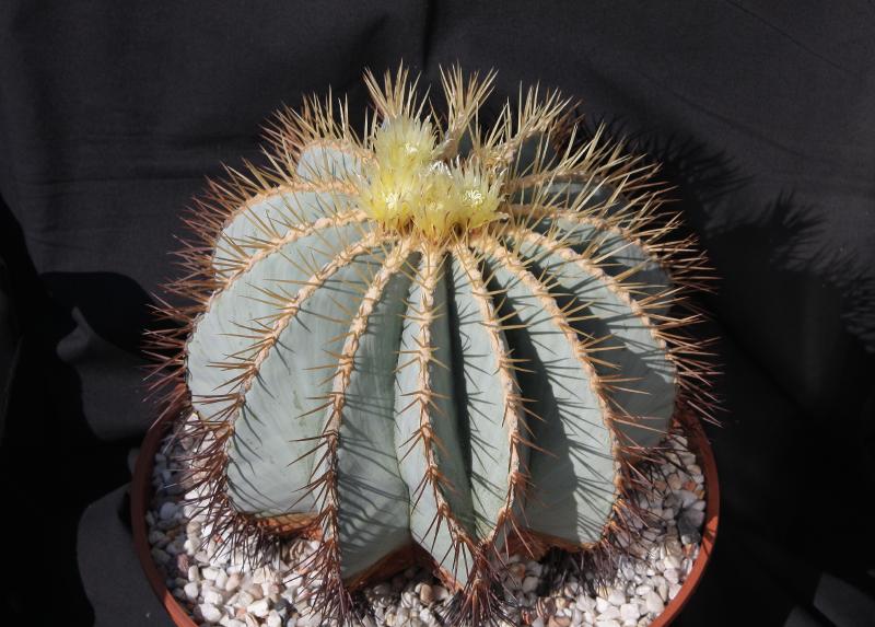 Der zweite Fero ist ein F. acanthodes var. tortulispinus, der gerade (nach 19 Jahren in Kultur und einem Durchmesser von 14 cm) zum ersten Mal blüht.